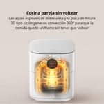 Las aspas espirales de doble aleta y la placa de fritura 3D tipo ciclón generan convección 360° para que la comida quede uniforme sin tener que voltear.