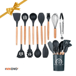 Set de 12 utensilios de silicona con mango de madera (resistentes al calor).