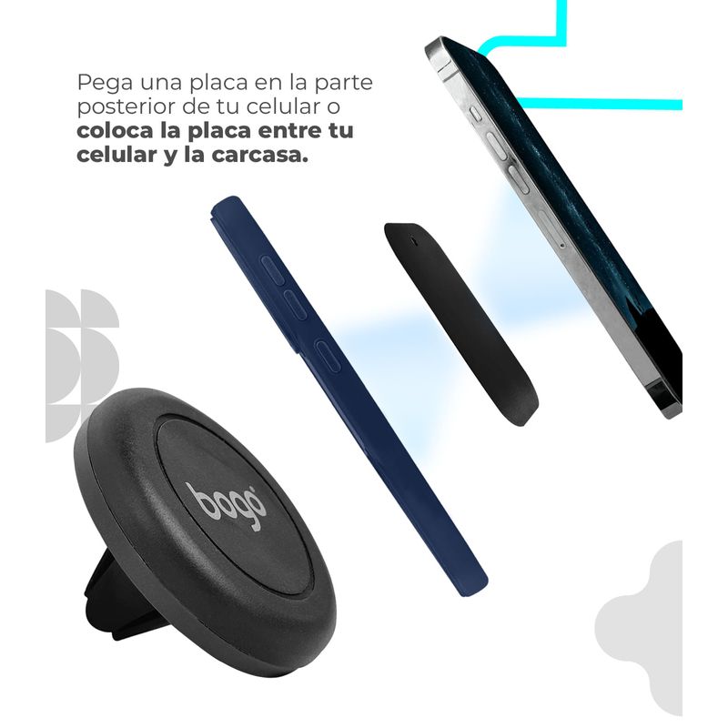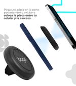 Inserta el soporte en la rejilla del aire, pega una placa en la parte posterior de tu celular o coloca la placa entre tu celular y la carcasa y listo, sólo colócalo sobre el holder y se unirán inmediatamente de una forma segura.