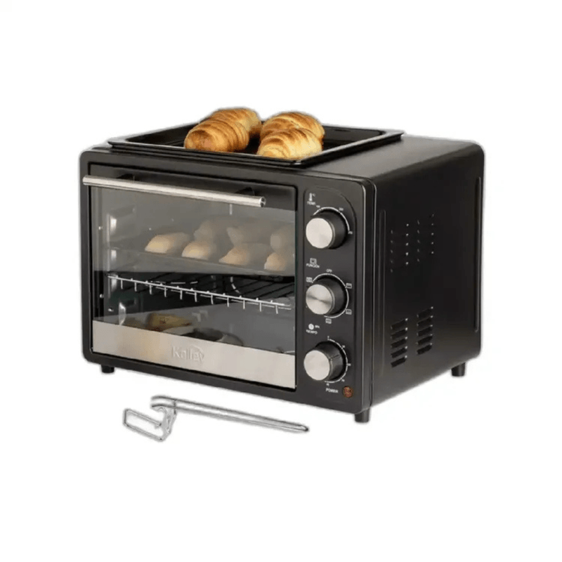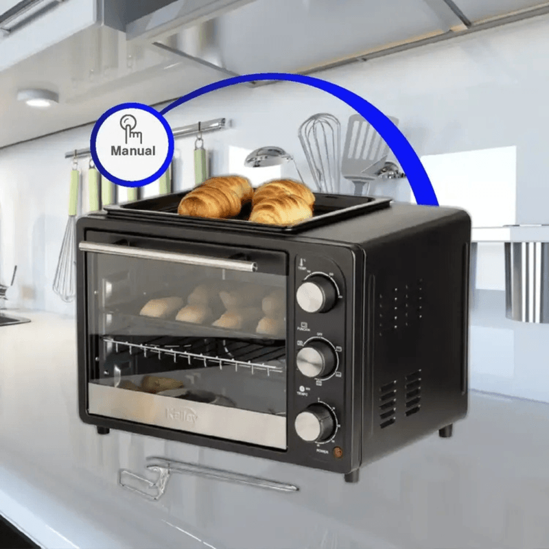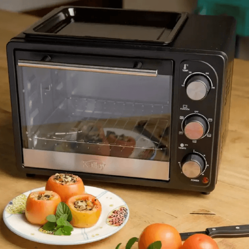 Horno tostador de 18 litros con potencia de 1200W, selector de funciones y bandeja superior para asar mientras horneas.