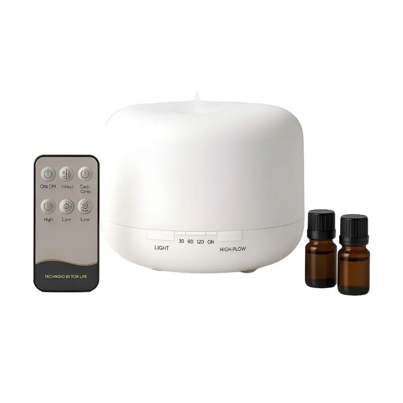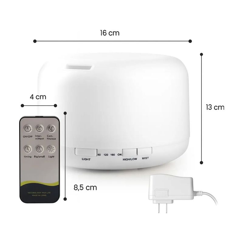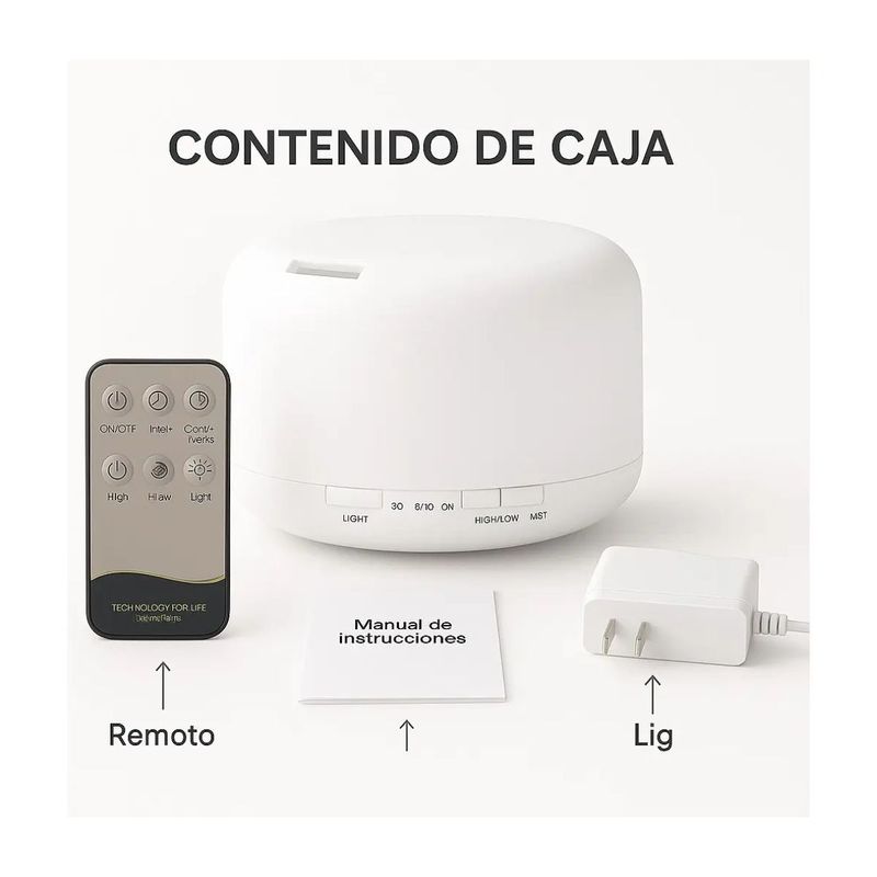 Incluye: 1 Difusor Ultrasónico de 500ml, 2 Esencias, 1 Control Remoto, 1 Adaptador de Corriente,