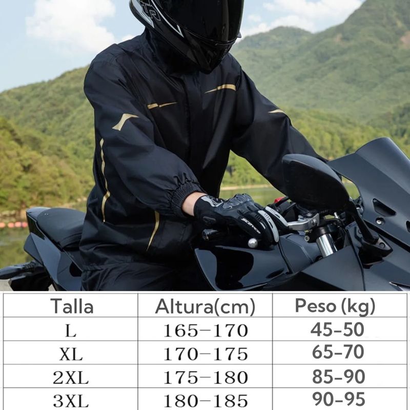 Traje impermeable diseñado para motociclistas que necesitan protección confiable contra la lluvia y el viento mientras conducen. Este conjunto incluye chaqueta y pantalón fabricados con material resistente al agua que ayuda a mantener el cuerpo seco durante trayectos en clima húmedo. Su diseño cómodo permite usarlo fácilmente sobre la ropa o el equipo de conducción, brindando libertad de movimiento y mayor seguridad en carretera.