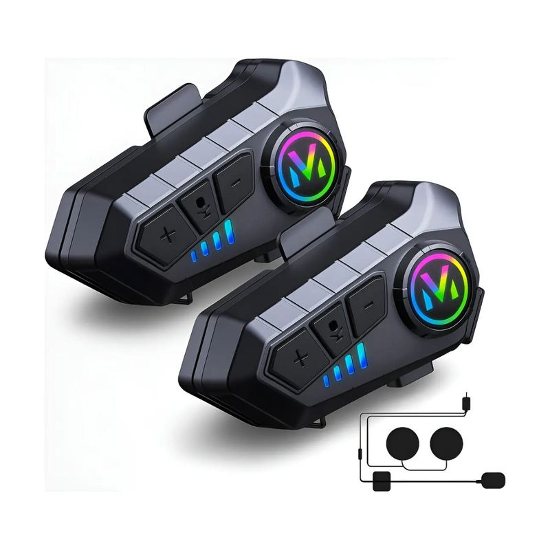 Incluye: 2 Intercomunicadores, 2 Audífono + Micrófono, 2 Cable de carga USB-C, 2 Clip de montaje, 2 Velcros adhesivos