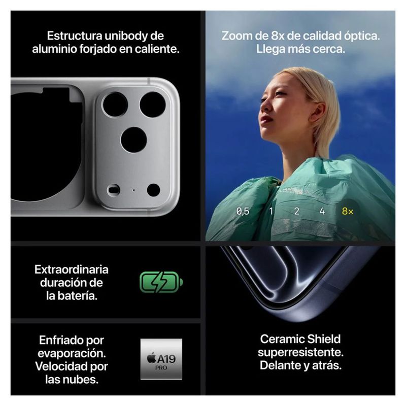6,3 pulgadas, diseño unibody de aluminio, chip A19 Pro, cámaras traseras de