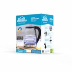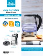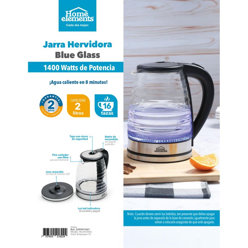 Calienta agua de forma rápida y segura con la Jarra Hervidora Blue Glass Home Elements. Con 1400W de potencia, tendrás agua lista en solo 8 minutos para preparar café, té o tus bebidas favoritas. Su capacidad de 2 litros (hasta 16 tazas) la hace ideal para toda la familia. Además, cuenta con tapa de seguridad, apagado automático y base giratoria 360° que facilita su uso. ¡Elegancia y practicidad en tu cocina!