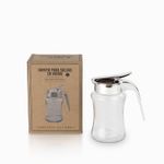 Jarra pequeña de vidrio, con tapa y mango de plástico cromado. Muy apropiada para almacenar y servir miel, sirope o jarabes de frutas, pues el sistema de palanca deslizante de su tapa está diseñado para eliminar goteos y pegotes indeseados mientras se vierte el contenido. También puede usarse para envasar algunos aderezos y aceites de uso frecuente.