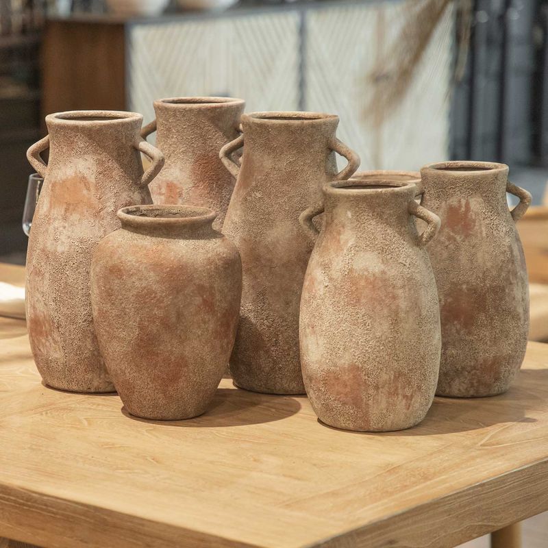 Jarrón en gress color terracota, su diseño moderno y disruptivo le aporta personalidad al espacio. Es tan versátil que puede usarse como centro de mesa o florero.