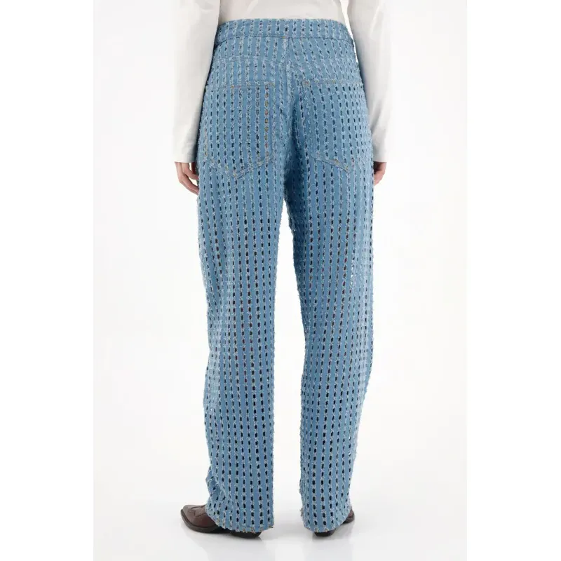 Este jean para mujer presenta una silueta Barrel de tiro medio, reconocida por su volumen sutil en la pierna y su fit relajado que estiliza sin apretar. Su diseño incluye cinco bolsillos tradicionales y un acabado especial logrado mediante proceso de cortes láser, lo que le da un look contemporáneo, definido y lleno de carácter. Es una prenda versátil, ideal para crear outfits casuales, urbanos y con mucha personalidad gracias a su estilo desagujado con detalles de perlas.