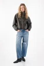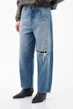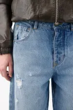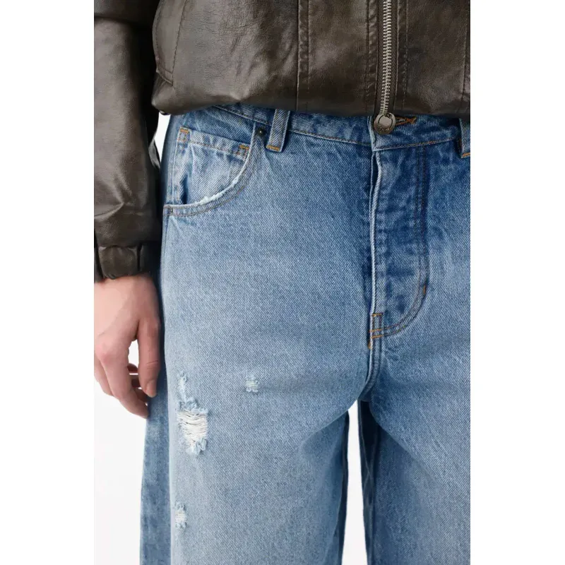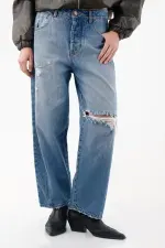 Este diseño horseshoe ofrece una silueta amplia y curvada que aporta estilo y personalidad sin perder comodidad. Su tiro medio y su construcción en denim de lavado medio le dan un aire relajado y moderno, mientras que los rotos localizados y el acabado destroyed en las bocas de los bolsillos y la bota le imprimen un toque rebelde y urbano perfecto para looks casuales con carácter.