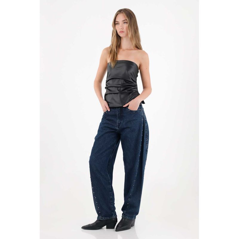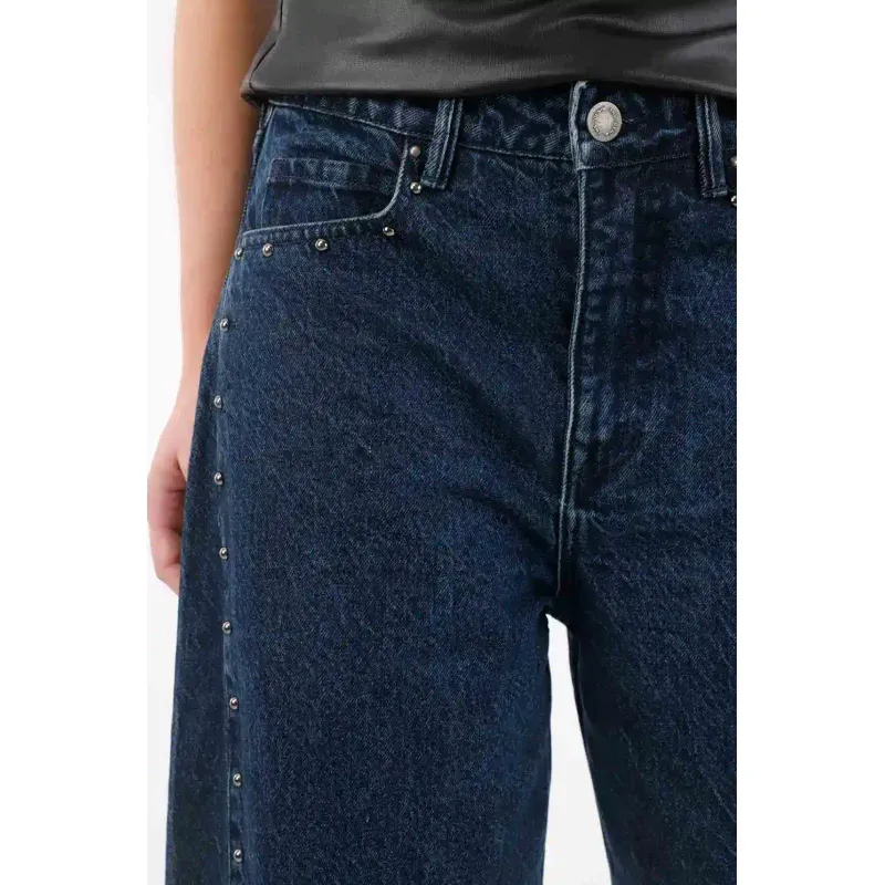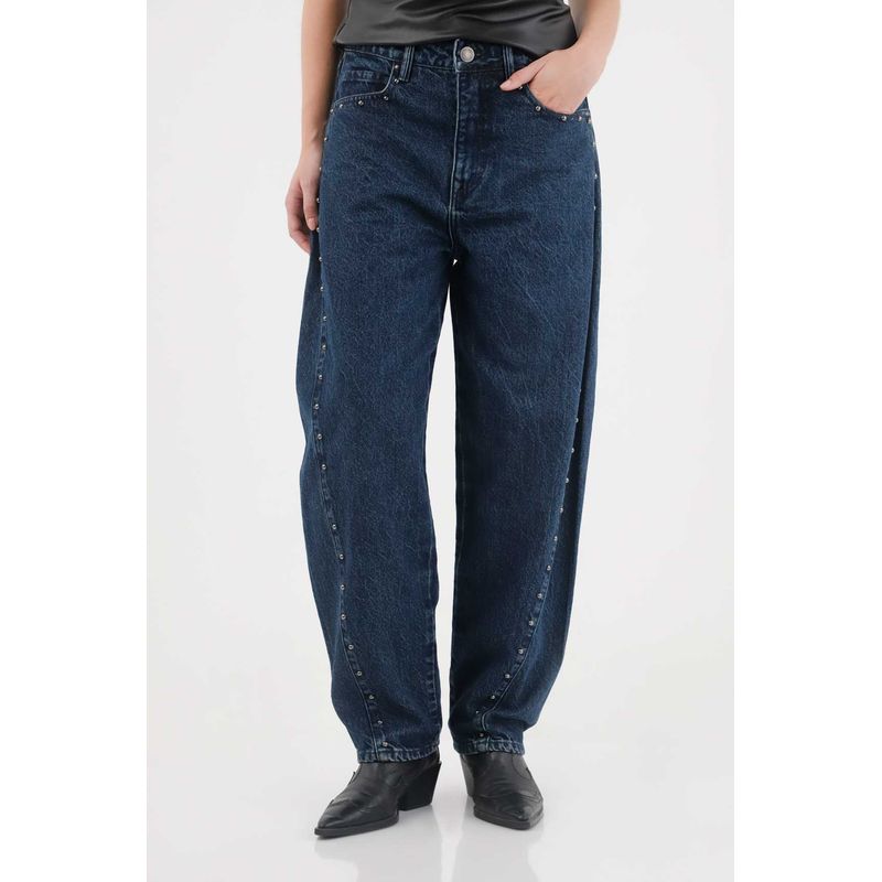 Este mom jean captura la nostalgia de los noventa con un giro moderno: taches que iluminan los cortes delanteros y un azul medio que se adapta a cualquier estilo. Perfecto para looks relajados con camisetas básicas o para elevarlo con una camisa romántica y botas de cuero.