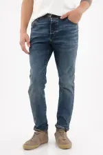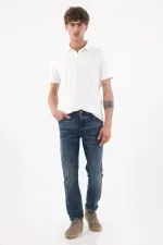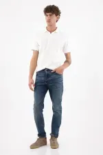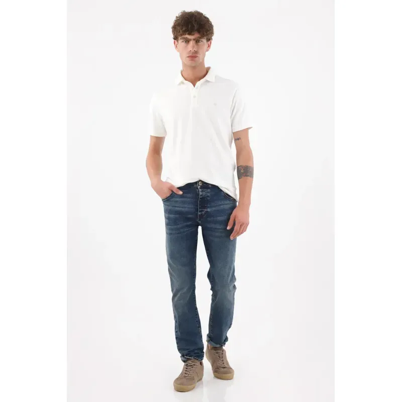 Fit & Styling Llévalo con una polo blanca metida por dentro y una sobrecamisa ligera abierta; dobladillo mínimo en el ruedo para realzar el fit. Un jean azul índigo para hombre que funciona en un estilo casual contemporáneo, perfecto para la ciudad.