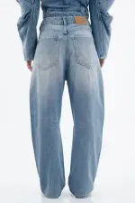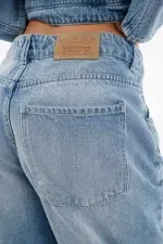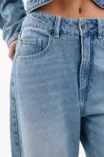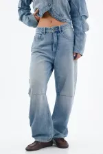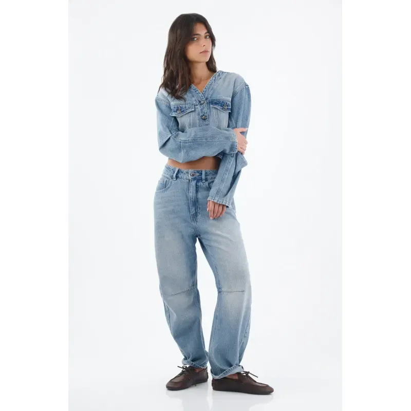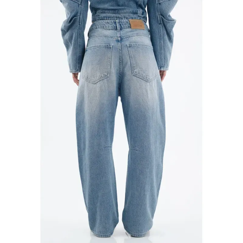 Confeccionado en denim de tejido plano y pesado 100% algodón, este jean dibuja una silueta arqueada y relajada que afina el tobillo sin perder presencia en la pierna. El azul lavado con desgastes suaves le da frescura urbana, mientras la costura horizontal a la altura de la rodilla enfatiza la forma y aporta estructura. La cintura con pretina y el botón visible ordenan la parte superior para un fit limpio y funcional, y los bolsillos frontales completan el enfoque práctico del día a día.
