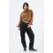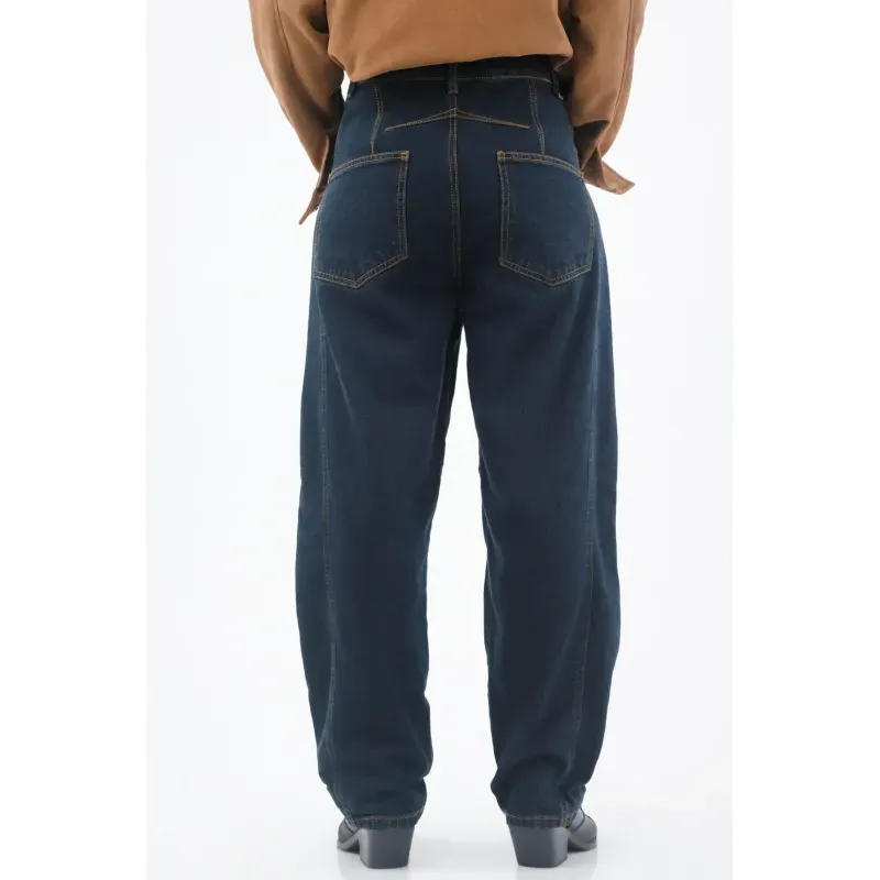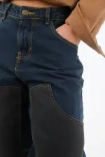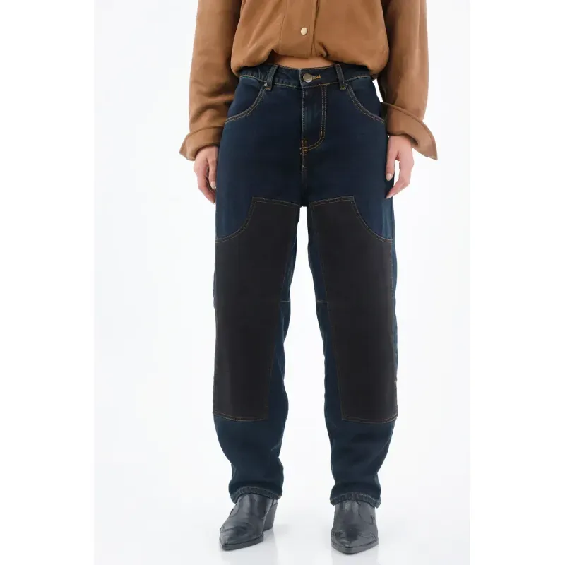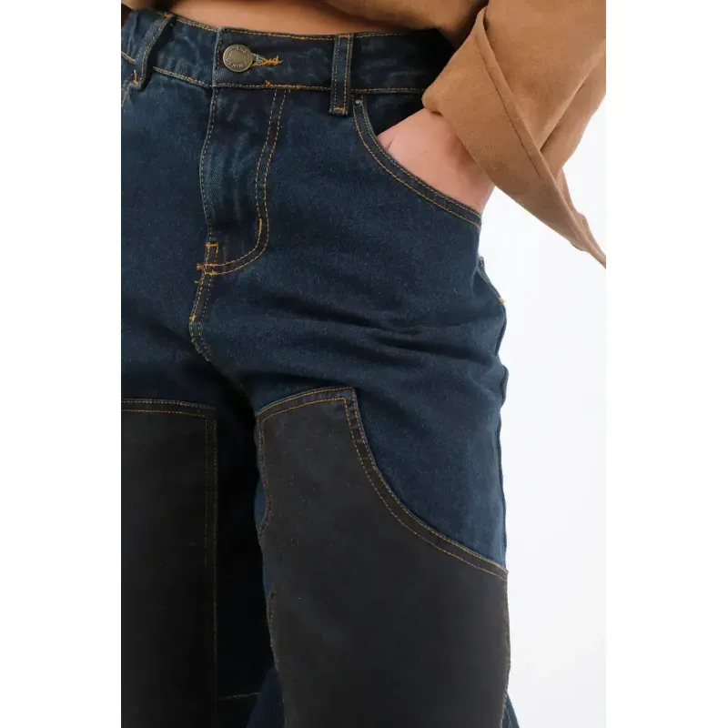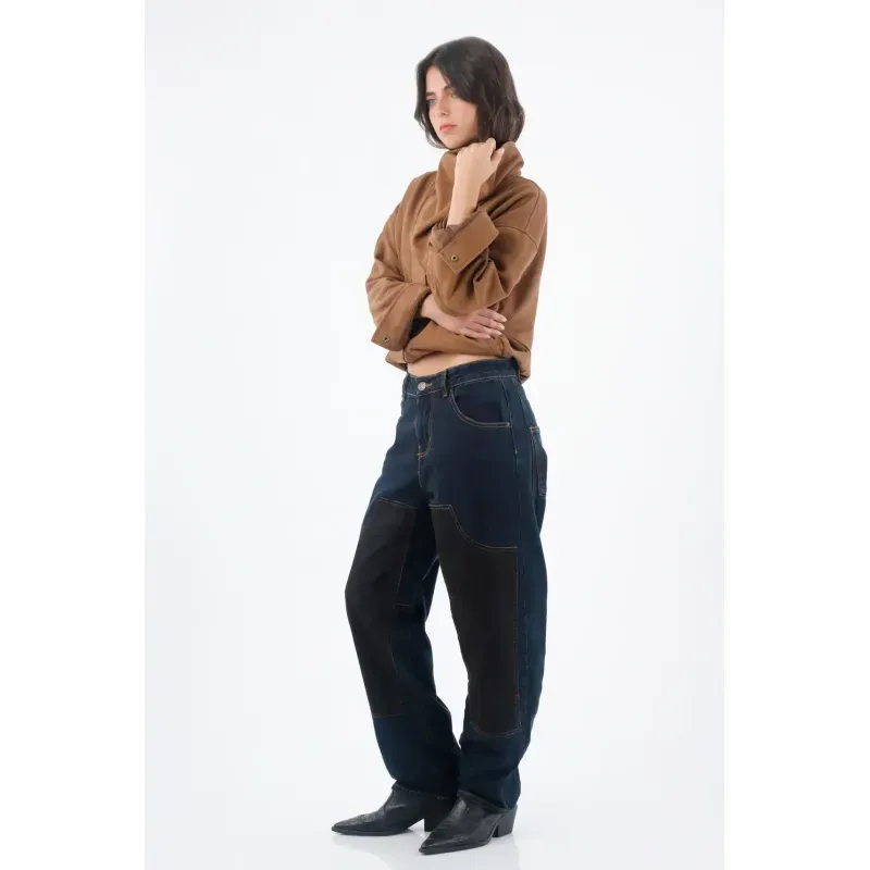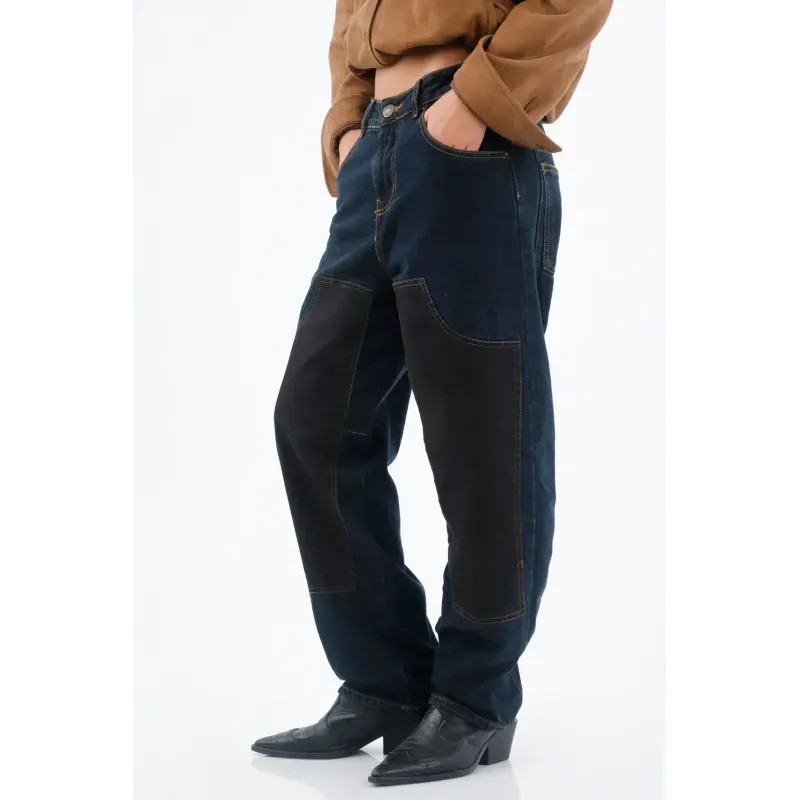 Este jean TNS para mujer en denim 100% algodón combina índigo oscuro con paneles frontales en tono carbón; ese juego bicolor aporta vibra utilitaria y afina visualmente la pierna con líneas limpias. La silueta de fit relajado y pernera recta cae suelta y cómoda para el ritmo urbano. Las costuras visibles en ocre enmarcan los bolsillos delanteros y realzan el diseño, mientras la pretina con botón metálico sella un acabado clásico y fácil de combinar.