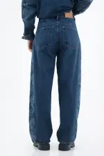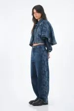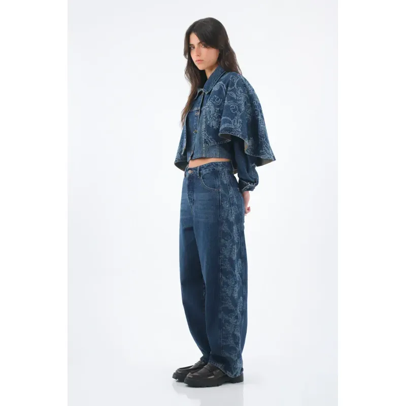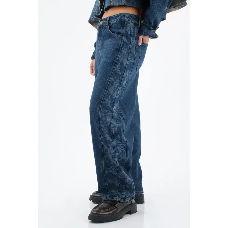 Este jean propone una silueta de pierna amplia con ese arco sutil tipo horseshoe que suma movimiento y actitud. El denim en azul índigo medio-oscuro mantiene el look limpio y fácil de combinar, mientras el lateral con estampado tonal agrega un guiño gráfico que te distingue sin esfuerzo. Algodón 100% para una estructura auténtica de jean; costuras a contraste y botón metálico frontal sellan el carácter urbano.