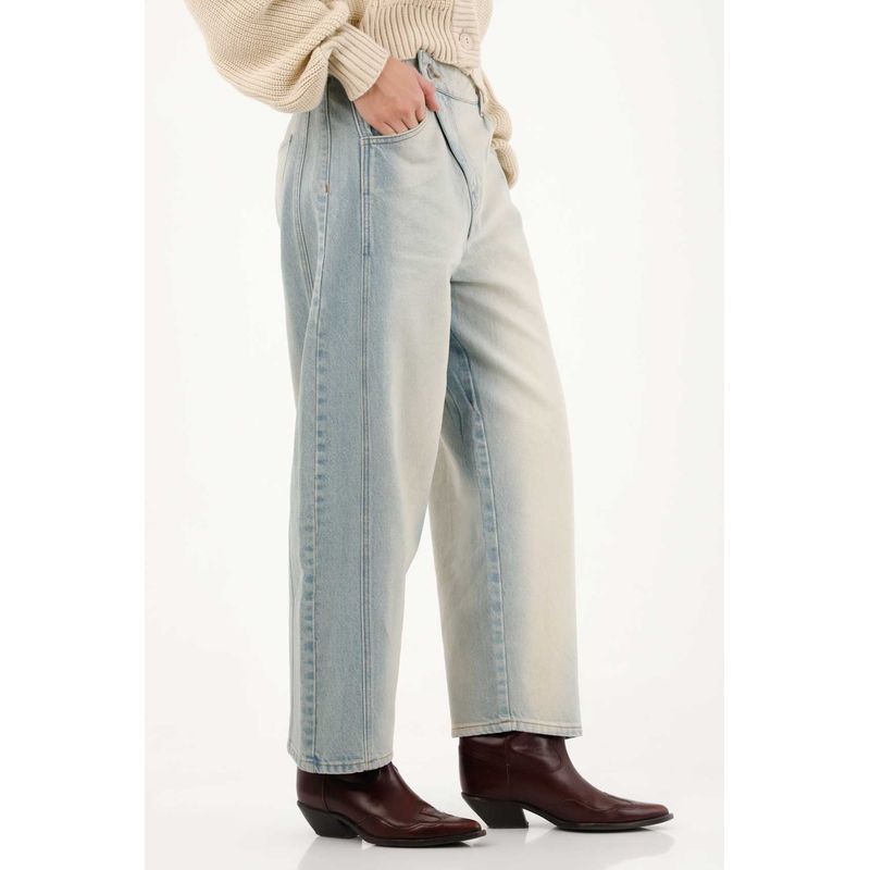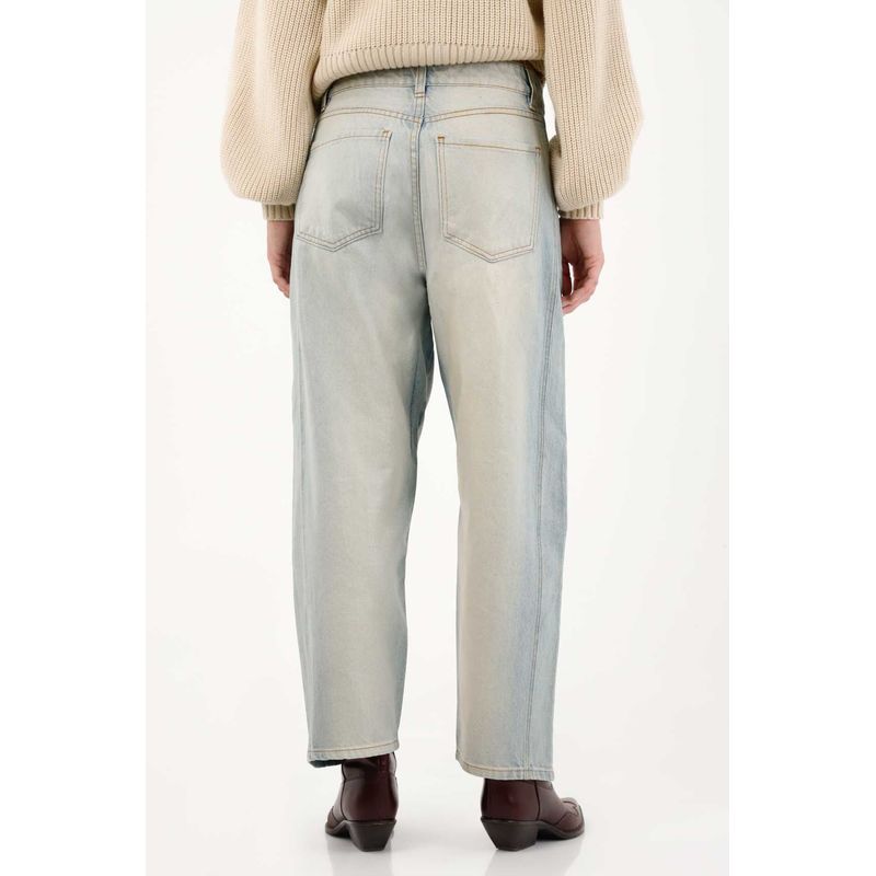 Confeccionado en denim de lavado medio con efecto resinado que aporta textura y carácter. Silueta recta, tiro bajo y detalles de pretina inclinada que favorecen la figura.