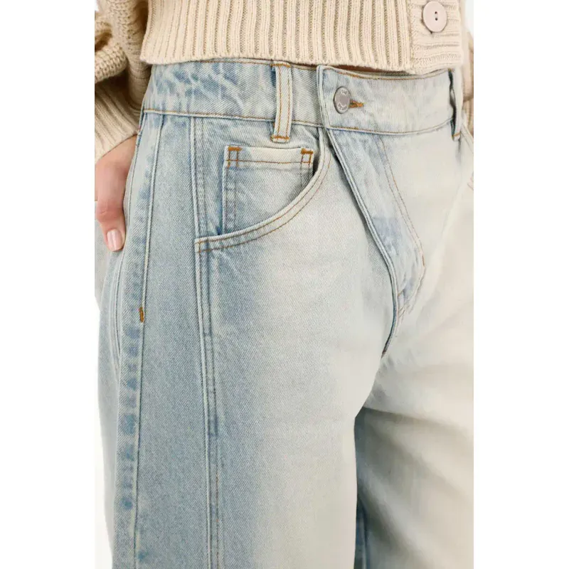 Su silueta recta y tiro bajo define un look relajado pero lleno de estilo. La pretina y jota inclinada aportan un detalle inesperado que transforma un básico en un must-have del closet. Perfecto para combinar con camisetas oversized, camisas clásicas o chaquetas, convirtiendo cualquier outfit en algo más original.