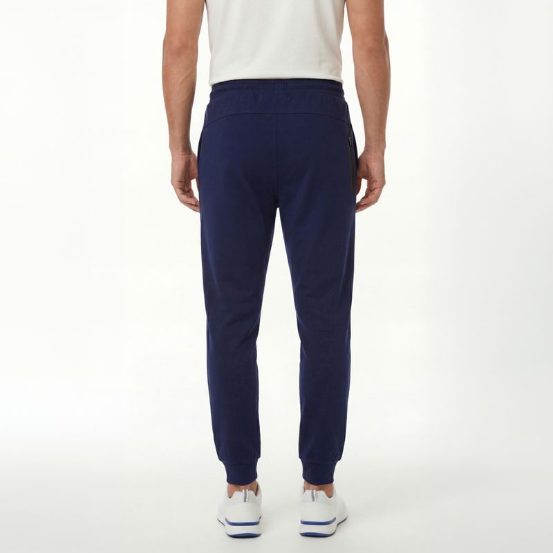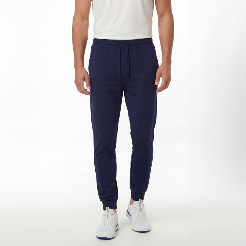 Jogger deportivo para hombre en color azul, con cintura elástica y cordón ajustable para un ajuste cómodo. Incorpora bolsillos laterales funcionales y bolsillo trasero termosellado con cierre. Sus botas con elástico brindan mayor comodidad y un ajuste práctico durante la actividad física.
