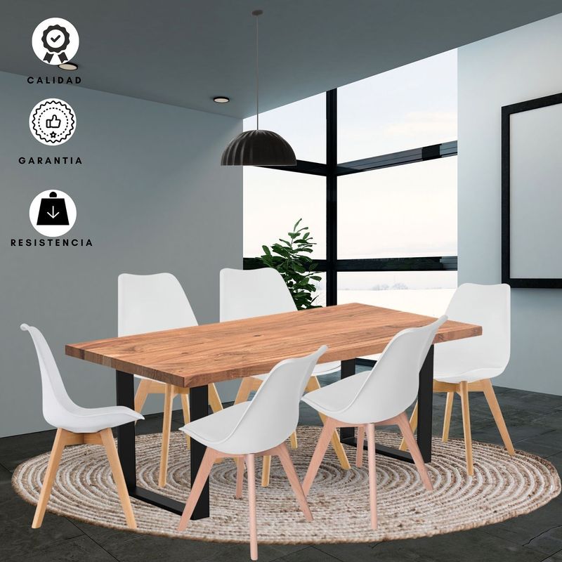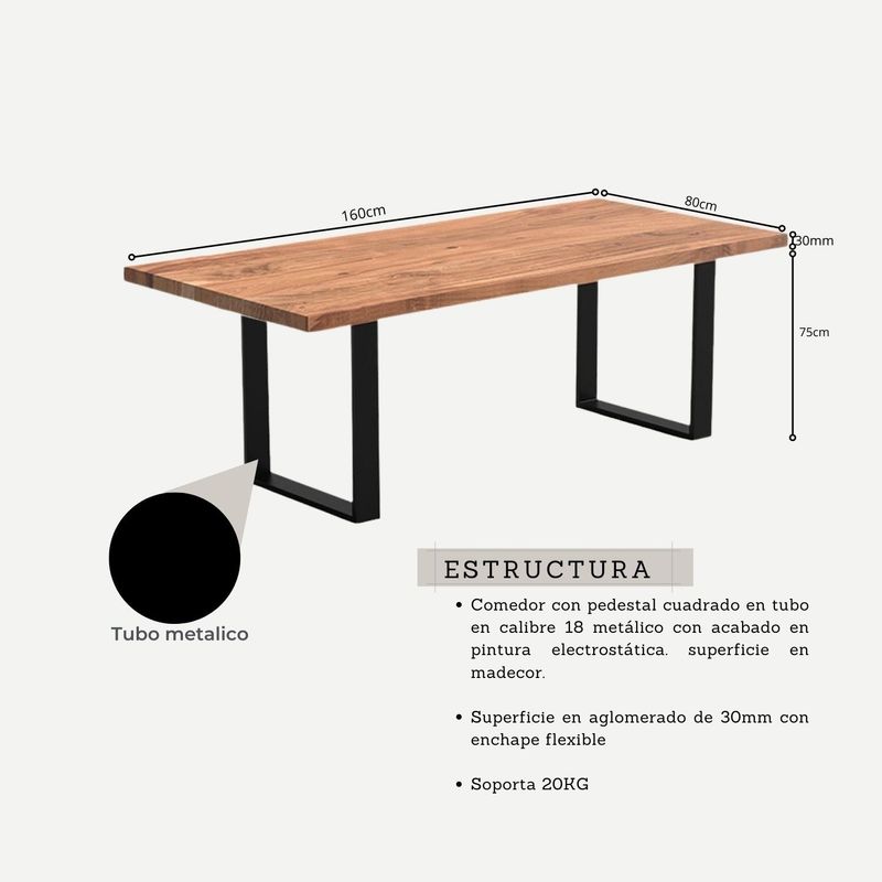 Haz de cada comida un momento especial con nuestros juegos de comedor. Encuentra el estilo ideal para tu hogar. Comedor con pedestal cuadrado en tubo 2 x2 pulgadas en calibre 18 metálico con acabado en pintura electrostática negra. superficie en madecor color Beyota de 30mm de grosor. Superficie en aglomerado con enchape flexible. Silla milano tapizada con estructura en polipropileno, Asiento Acolchado. Patas: Madera, Acabado Roble. llegan para darle un estilo de elegancia y estilo a tus espacios, ideal para ofrecerte un buen confort y así darles un ambiente nuevo y llamativo a tus espacios. Las medidas de este producto son: Mesa: Alto: 75 cm Largo: 160 cm Ancho: 80 cm Silla: Alto: 83 cm Largo: 42,5 cm Ancho: 49 cm El plazo de entrega de este producto es de 8 a 12 días hábiles. Su garantía es de 1 año por defectos de fabrica. Los elementos decorativos y la ambientación no están incluidos con este producto.