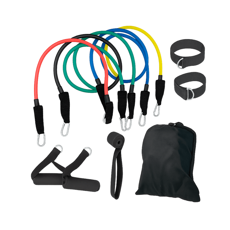 5 bandas tubulares (130?cm), 2 agarres para manos, 2 adaptadores de tobillo, 1 anclaje para puerta, 1 estuche.