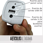 Características Puerto USB 5V 0.5A Bombillo linterna principal de 3W Autonomía aproximada de hasta 8 horas Tiempo de carga estimado 8 a 10 horas Dimensiones aproximadas del panel: 16 x 10.5 x 1.2 cm Dimensiones aproximadas de la linterna modulo de control 15.6 x 5.5 x 5.5 cm Largo aproximado del cable del panel 2 metros Largo aproximado del cable de cada bombillo 2 metros