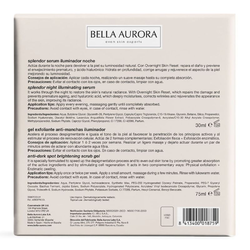 Componentes | Serum: Ingredients/Ingredientes: Aqua, Butylene Glycol, Glycereth-26, Pentylene Glycol, Caprylic/Capric Triglyceride, C15-19 Alkane, Glycerin, Betaine, Silica, Propanediol, Sodium Hyaluronate, Diacetyl Boldine, Lavandula Angustifolia Flower Extract, Polyacrylate Crosspolymer-6, Acrylates/C10-30 Alkyl Acrylate Crosspolymer, Methylpropanediol, Sodium Phytate, Caprylyl Glycol, Phenylpropanol, CI 17200, CI 42090, Parfum. Gel exfoliante: Ingredients/Ingredientes: Aqua, Pentylene Glycol, Isohexadecane, Synthetic Wax, PEG-200 Hydrogenated Glyceryl Palmate, Propanediol, PEG-7 Glyceryl Cocoate, Bacillus Ferment, Jojoba Esters, Sodium Polyacrylate, Hydrogenated Polydecene, Acrylates/ Vinyl Isodecanoate Crosspolymer, Glycerin, Propylene Glycol, Trideceth-6, Sodium Hydroxide, Sodium Phytate, Potassium Sorbate, CI 77289, Parfum, Hexyl Cinnamal, Benzyl Benzoate. |
