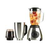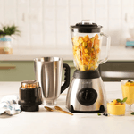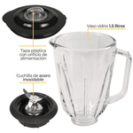 Licuadora de 500W con vaso de vidrio y vaso en acero inoxidable de 1.5L, incluye picatodo. Cuerpo en acero inoxidable, cuchillas de acero de 4 aspas y tapa plástica con orificio de alimentación.