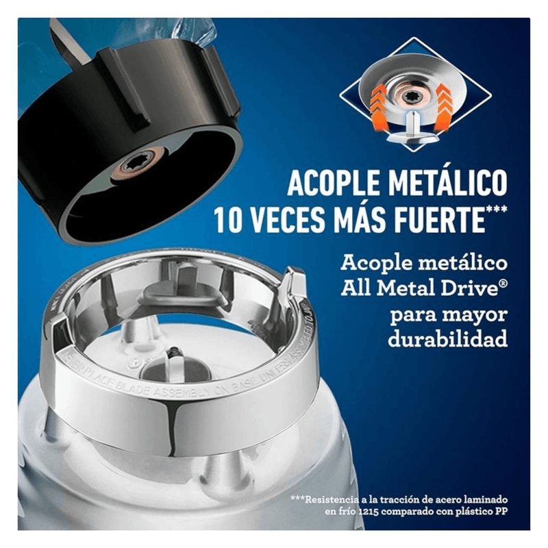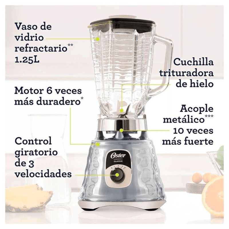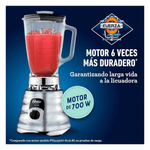 Descripción Durante décadas Oster está comprometida en el lanzamiento de productos domésticos para que sientas la pasión de crear nuevas recetas con facilidad. Descubre un mundo de posibilidades en la cocina con la licuadora BLSTBESTE y dale rienda suelta a la creatividad Las icónicas licuadoras Oster® son sinónimo de eficiencia y durabilidad. Y ahora, el nuevo diseño moderno de la espectacular licuadora clásica Oster® en aluminio reinventada y modernizada con tecnología de motor reversible, te brinda una mejor experiencia gracias a su motor seis veces más duradero, su novedoso diseño y sus controles ergonómicos. ¡Y estas son tan solo algunas de sus muchas otras ventajas! • Motor con tecnología reversible, gira las cuchillas a la izquierda y la derecha • 6 veces más duradero que le garantiza larga vida a la licuadora • Vaso de vidrio de 1,5 L resistente a choques térmicos, resiste ingredientes hirviendo • Acople metálico 10 veces más fuerte para mayor durabilidad • Acabado de primera calidad de aluminio en relieve con detalles pulidos y gráficos impresos • Revolucionaria cuchilla trituradora de hielo • Interruptor de palanca • Capacidad para 6 tazas • 700 watts de potencia Especificaciones • Peso: 1.58 kg • Medidas: 14.44 x 18.73 x 25.40 cm • Velocidades: 2 • Programas automáticos: No • Interface: Palanca • Accesorios incluidos: No • Potencia en watts: 700 • Función de pulso: No • Tecnología Reversible: Sí • Material del vaso/jarra: Vidrio resistente • Capacidad del vaso/jarra: 1.5 L • Número de aspas: 4