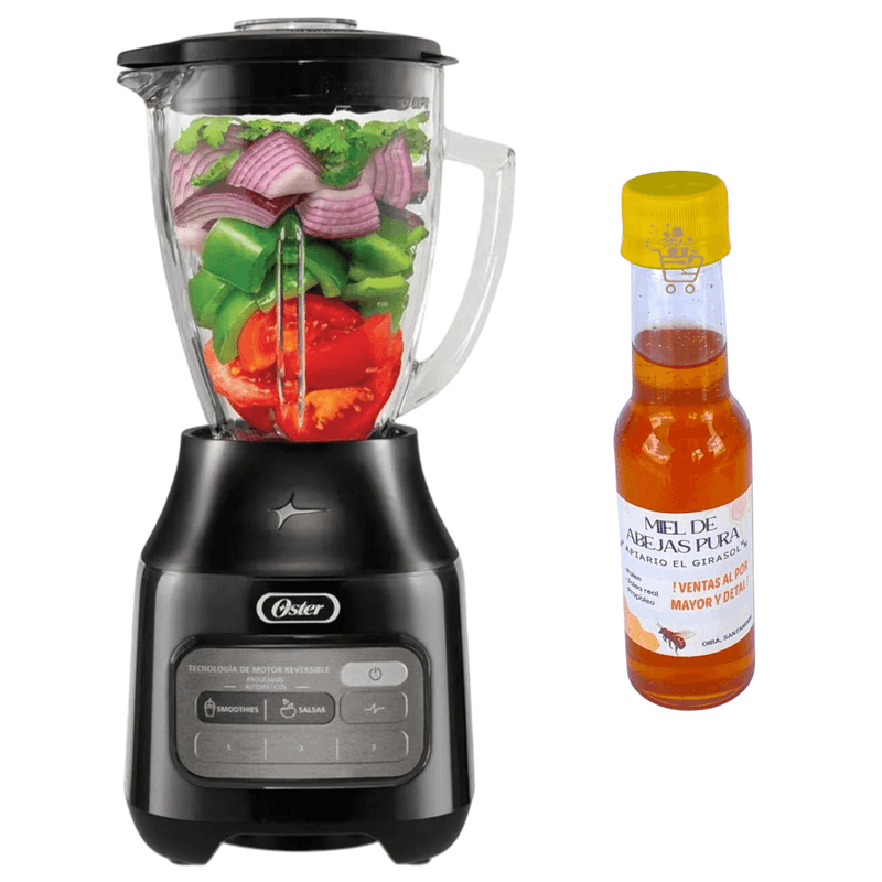 Durante décadas Oster está comprometida en el lanzamiento de productos domésticos para que sientas la pasión de crear nuevas recetas con facilidad. Descubre un mundo de posibilidades en la cocina con la licuadora BLSTPEG-BRT-013 y dale rienda suelta a la creatividad. as Licuadoras Oster® con tecnología reversible, 2 programas automáticos y 3 velocidades más pulso brinda un sistema de licuado que lo tiene todo. Cuentan con un poderoso motor 4 veces más duradero* con 800 W de potencia** y durabilidad comprobada para 10.000 licuados. Las nuevas licuadoras con moderno y elegante diseño Oster® con 2 programas automáticos y 3 velocidades más pulso, poseen la tecnología de motor reversible de Oster® que gira sus cuchillas en ambas direcciones, para procesar completamente todos los ingredientes. Tienen un potente motor de 800 W de potencia pico que es 4 veces más duradero. Esta licuadora tiene una potencia nominal de 600 W y una potencia pico de 800 W Su vaso de Boroclass® con capacidad de 1,5 Litros es resistente a un choque térmico de 90°C***, por lo que se pueden hacer sopas y otros platillos calientes con confianza. Además, tiene una revolucionaria cuchilla pica hielo para preparar los mejores jugos y smoothies. Su acople metálico es 10 veces más fuerte**, por lo que no tendrás ninguna dificultad procesando los más duros ingredientes. Todas sus piezas son desmontables para una fácil limpieza. Vaso de vidrio Boroclass® resistente a ingredientes hirviendo***, para que no tengas que esperar a que los ingredientes calientes se enfríen para usar la licuadora Revolucionaria cuchilla trituradora de hielo de 6 aspas Acople metálico 10 veces más fuerte** Motor 4 veces más duradero* 3 velocidades + pulso Tecnología Reversible 2 programas automáticos Botella de miel de 175ml, miel de abeja 100% natural creada en panales rodeados de árboles de acacia, que cuando florecen, le dan ese sabor único, especial y delicioso.