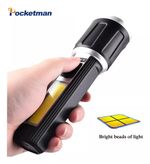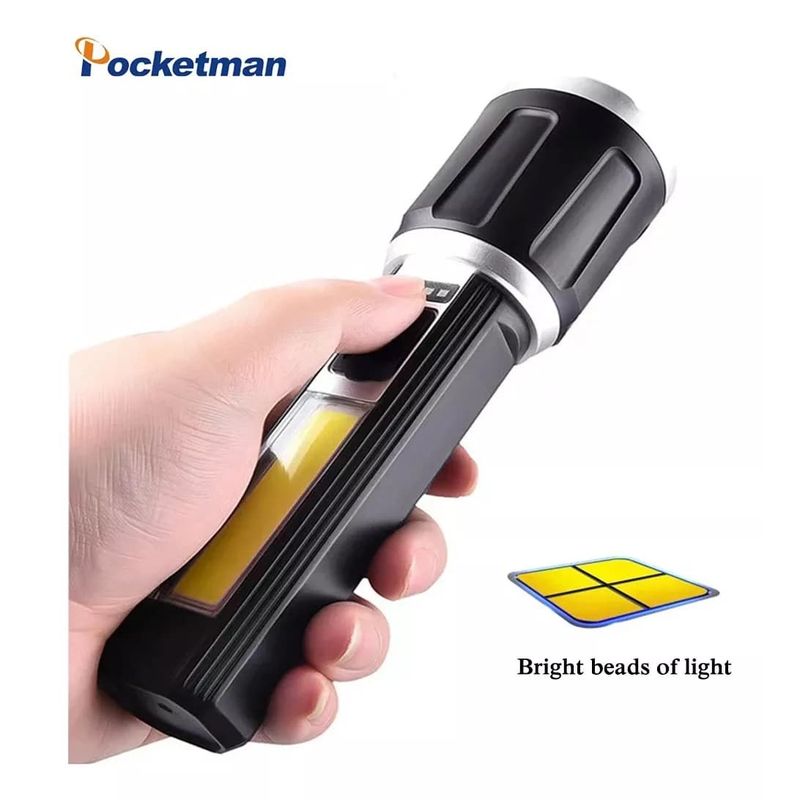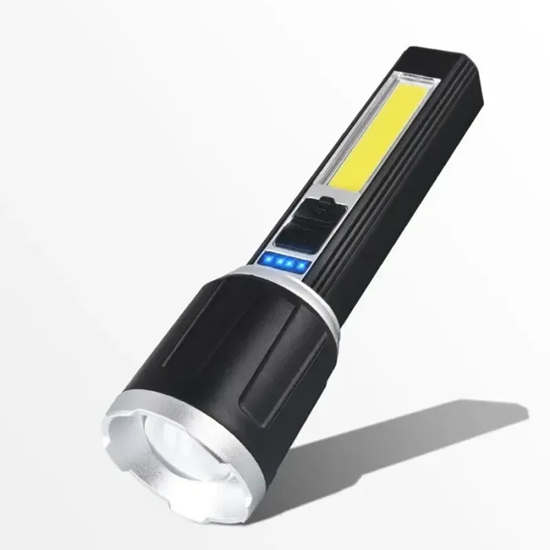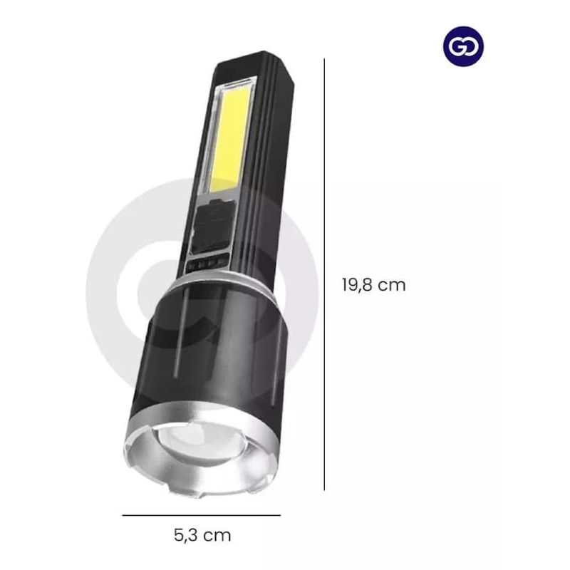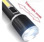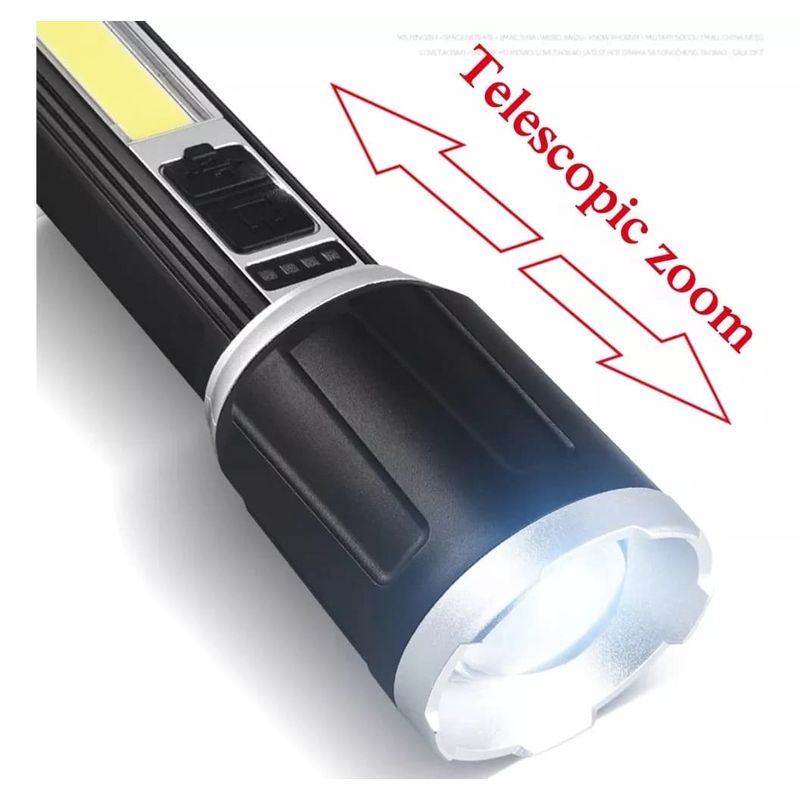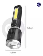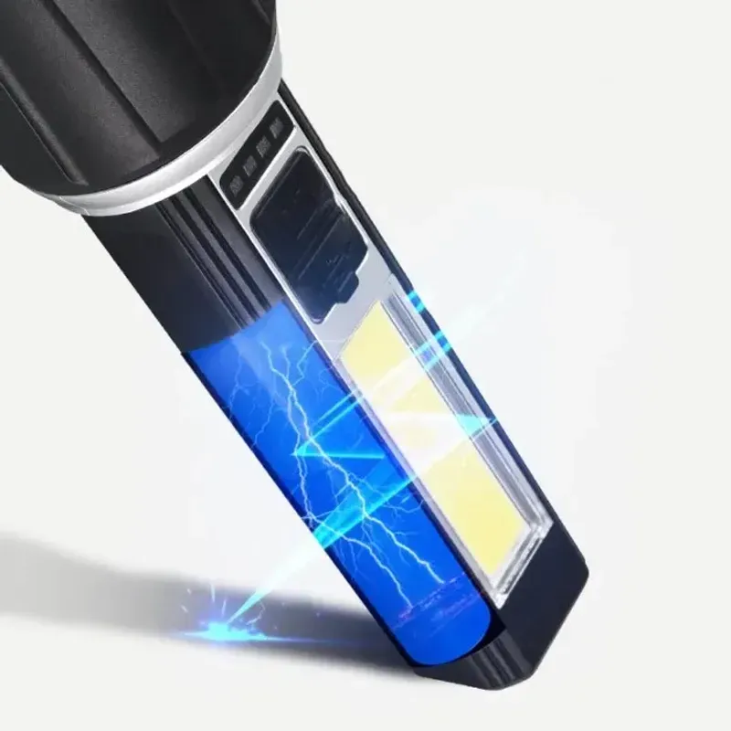 La funcionalidad ZOOM te permite ajustar el enfoque de la linterna para adaptarse a tus necesidades, ya sea concentrando la luz en un punto específico o expandiéndola para iluminar un área más amplia. El panel de LED lateral añade una capa adicional de versatilidad, proporcionando una fuente de luz adicional para diversas situaciones.