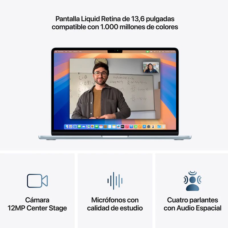 Su pantalla Liquid Retina de 13,6” es sencillamente impresionante: imágenes realistas, colores vibrantes y textos extremadamente definidos. Además, incorpora una cámara frontal de 12 MP, micrófonos de alta fidelidad y altavoces con Audio Espacial, brindándote una experiencia de comunicación y entretenimiento inmersiva.
