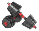 Set de Mancuernas de 40 KG/80LB con barras sólidas que permiten su conversión en una barra larga para ejercitar diversos grupos musculares. Superficies de agarre antideslizantes de aproximadamente 40 cm y roscas trapeciales para fijación segura de los discos. Cierres de rosca y estrella con anillos plásticos mantienen los discos firmemente unidos a las barras. Asas antideslizantes para un entrenamiento seguro y cómodo. Discos termo forrados en plástico para proteger el suelo y reducir el ruido.