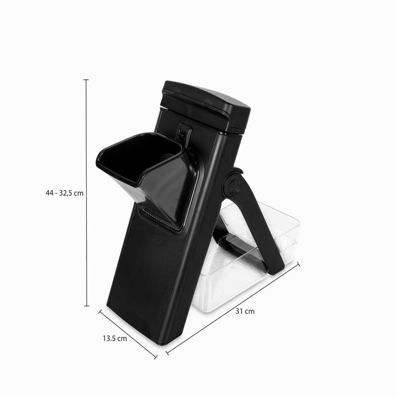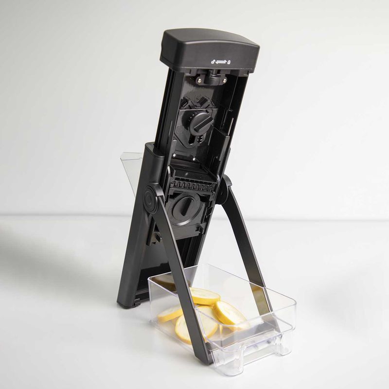 Mandolina Vertical que permite rebanar y cortar frutas y verduras en bastones, julianas y cubitos de diferentes grosores. Su diseño de hoja oculta permite procesar los alimentos de manera segura porque tus dedos no se acercarán a la hoja afilada, permitiendo cortar sin riesgo de lesionarse los dedos, gracias a su innovador diseño de seguridad es una opción recomendada para principiantes. Los componentes se pueden separar para una limpieza fácil y rápida.