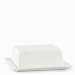 Mantequillero en porcelana rectangular con tapa. Un accesorio delicado para servir en la mesa mantequilla, margarina, queso fundido, paté u otro alimento de consistencia cremosa. Las paredes internas del plato mantienen el contenido compacto haciendo más cómodo y agradable el momento de tomarlo con la pala o cuchillo para untar. La tapa lo protege de insectos, polvo u otros elementos que puedan ensuciarlo.