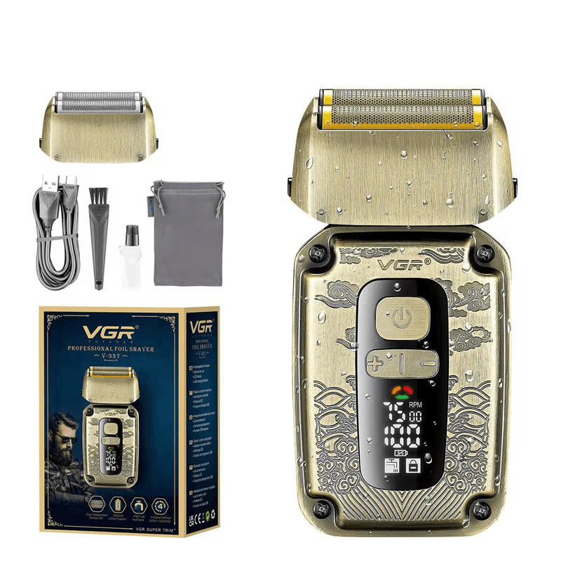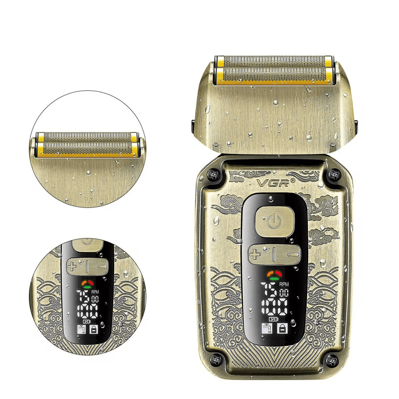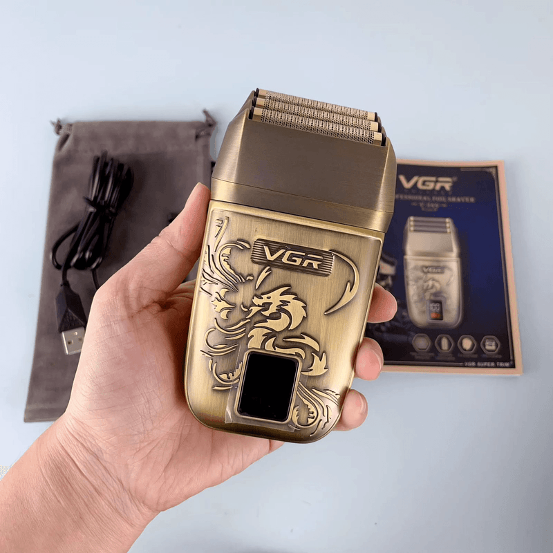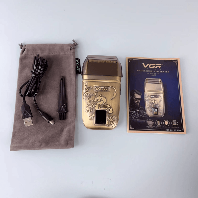 La Afeitadora Profesional VGR V-349 es la herramienta perfecta para quienes buscan un afeitado rápido preciso y cómodo. Su diseño dorado con grabado estilo dragón le da un toque elegante y moderno ideal tanto para uso personal como profesional en barberías.