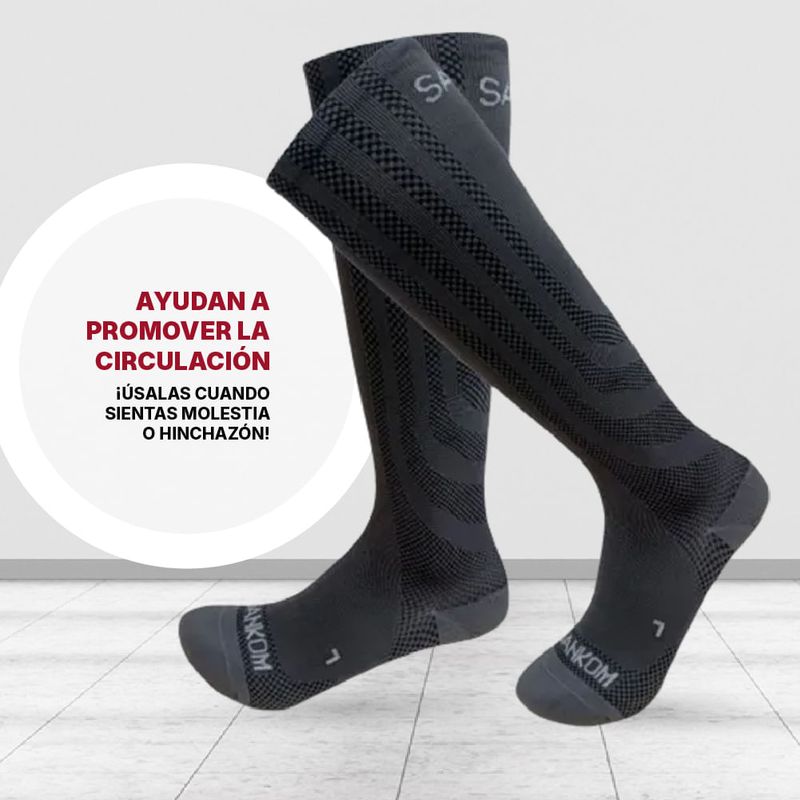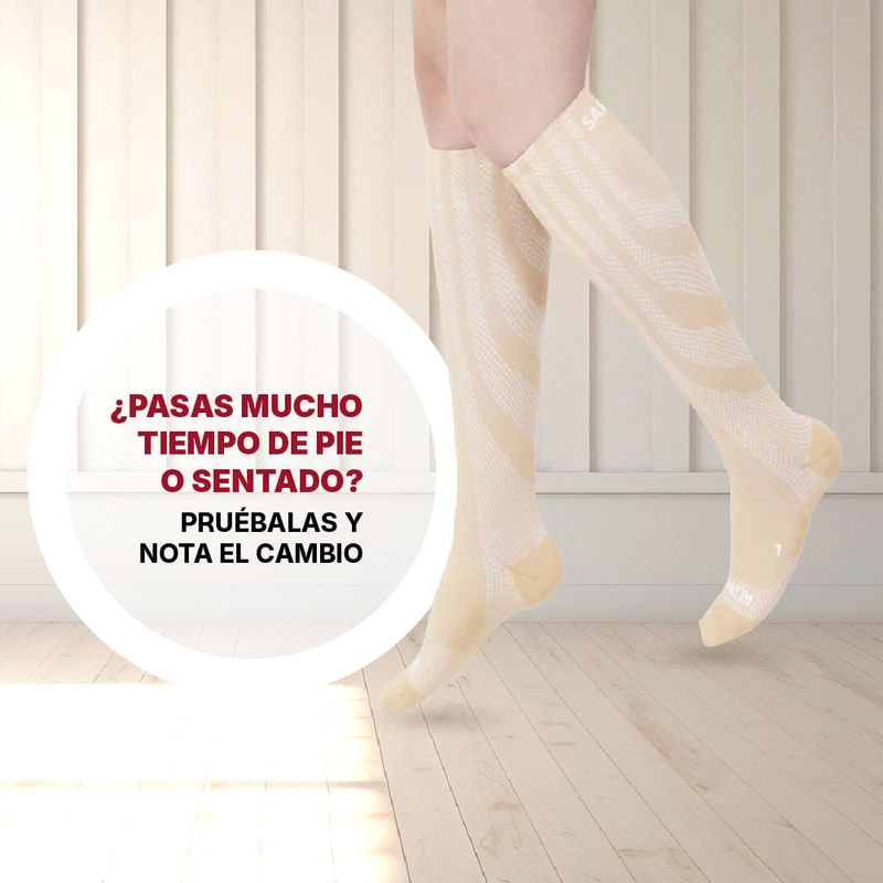 • Podrás usar los calcetines Sankom durante la mayor parte del día, siempre que sientas las piernas pesadas, o cansadas obteniendo relajación y descanso rápidamente, te ayudarán a prevenir la hinchazón, el dolor, el edema y a reducir la posible aparición de trombosis venosa profunda.