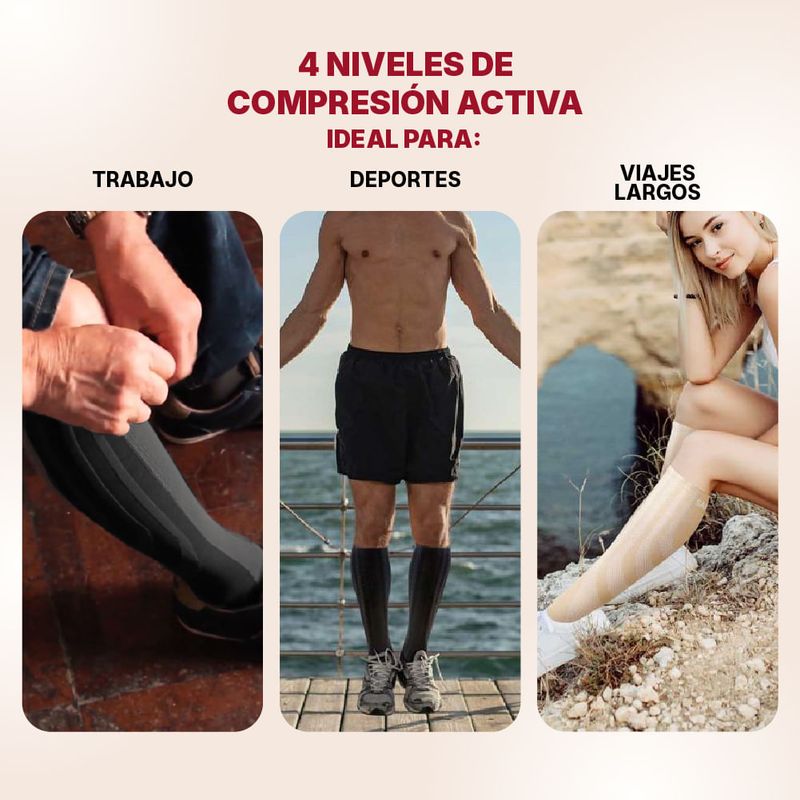 • Si eres una persona que viaja, o tu trabajo es sedentario, o trabajas jornadas largas, o incluso si estas embarazada, estas medias de compresión activa son para ti, ya que su diseño es unisex y su talla única se ajusta a tu necesidad de descanso. |