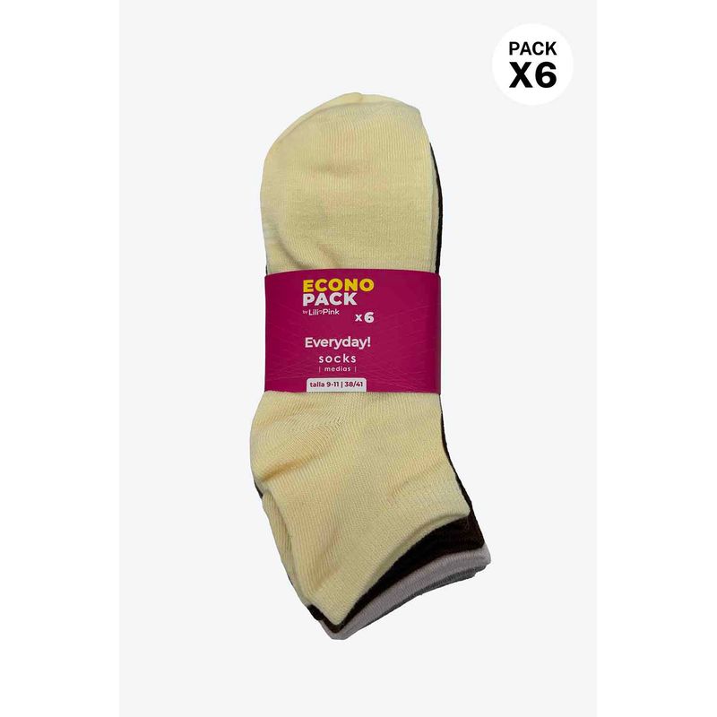 Pack de 6 medias tipo tobillera para mujer perfectas para combinar con distintos tipos de calzado. Confeccionadas en poliéster, un material resistente y cómodo, brindan un ajuste ligero y transpirable. Ideales para el uso diario, garantizando confort y durabilidad en cada paso.