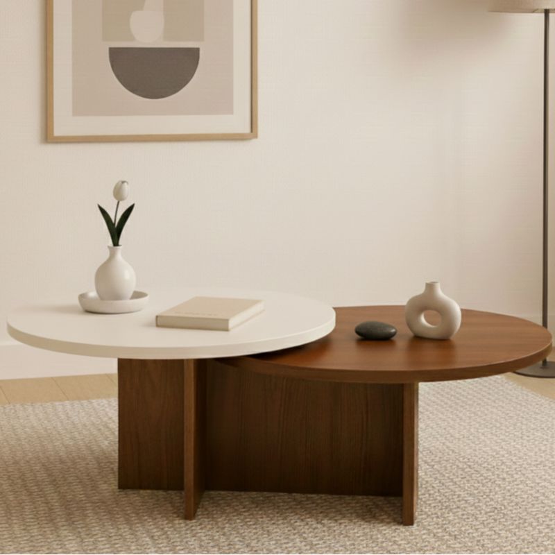 Mesa de Centro Doble Superficie en melamina 99,9% antimicrobiana. Diseño contemporáneo que fusiona elegancia y funcionalidad. Su estructura de doble superficie en tonos madera mácula y blanco crea un equilibrio visual perfecto, aportando calidez y sofisticación a tu sala.