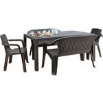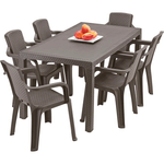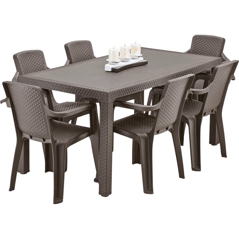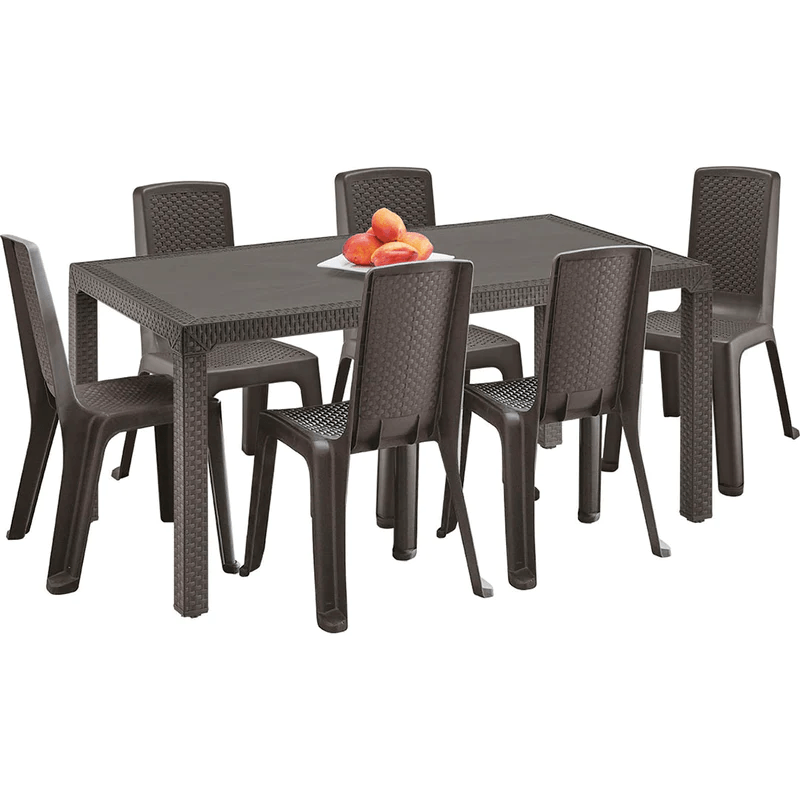 6 puestos, textura tejido imitación rattan, tacón nivelador y tapones antideslizantes en patas Mesa Rectangular de 80,5 x 150,5 cm y 72,5 Cm de altura; Comedor ideal con espacio para 6 puestos. Patas cuadradas , que brindan elegancia y una línea de diseño única. De apariencia Rattan y colores clásicos y elegantes; ideal para usos interiores o exteriores, práctica, fácil de limpiar y con todos los beneficios del plástico
