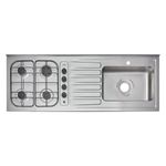 Mesón en acero inoxidable de 1.50 metros de ancho, con ubicación derecha del pozuelo, con encendido eléctrico, 4 fogones a gas natural con parrillas en alambrón con puntos de apoyo óptimos por recipiente para más seguridad. Cuenta con un sistema de anti-empozamiento en el lavaplatos y prensado en el centro del mesón que evita la acumulación de agua y el desplazamiento de líquidos al interior del mueble.
