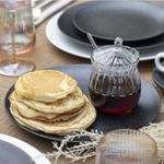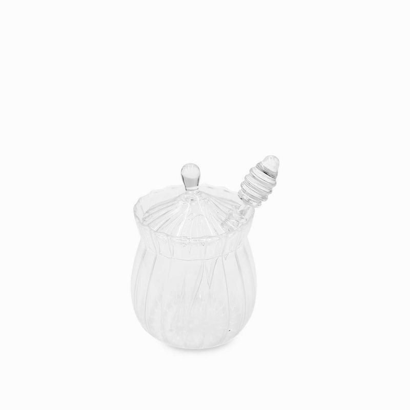 Recipiente de miel con tapa y dispensador que facilita servir. Con capacidad para 350 ml, su diseño es moderno y atemporal.