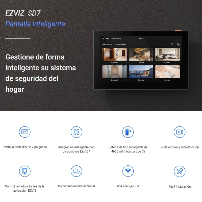El SD7 ofrece una gestión sencilla y directa para quienes poseen un sistema de seguridad integral para el hogar EZVIZ. Este elegante monitor táctil con gran capacidad de respuesta organiza varios dispositivos de seguridad en un solo panel, lo que permite acceder al estado del dispositivo y a las imágenes de video en una pantalla grande, además de personalizar fácilmente la configuración. Su diseño compacto se adapta a cualquier hogar moderno, y su configuración inalámbrica y versátil facilita la instalación.