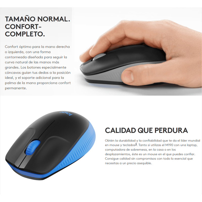 Logitech M190 es un mouse inalámbrico de tamaño normal con un confortable diseño contorneado que sigue la curva natural de las manos de tamaño mediano a grande.