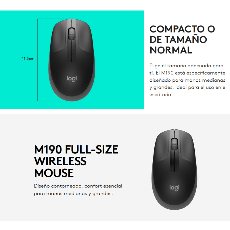 Elige el tamaño adecuado para ti. El M190 está específicamente diseñado para manos medianas y grandes, ideal para el uso en el escritorio. Si quieres un diseño más compacto y portátil, mira el M185.