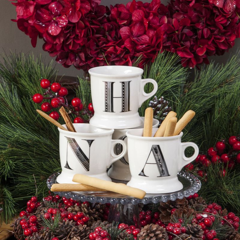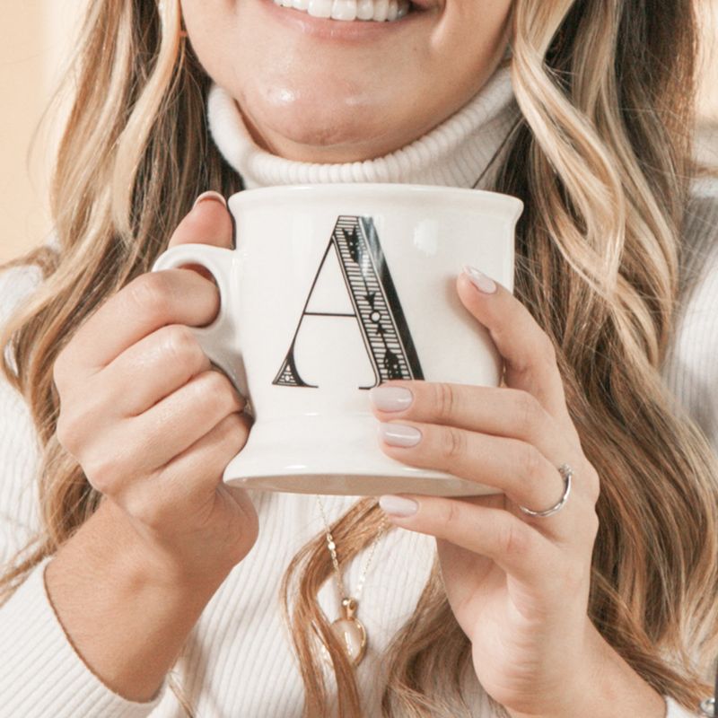 Mug en porcelana blanca de estilo vintage marcado con la letra A como un monograma del nombre de quien lo porta. Su tamaño generoso lo hace ideal para café, té o chocolate caliente, capacidad para 350 ml. Por su versatilidad se mezcla y combina fácilmente con otras vajillas. País de origen: China. Importador: Distribuidora Matec S.A.S
