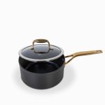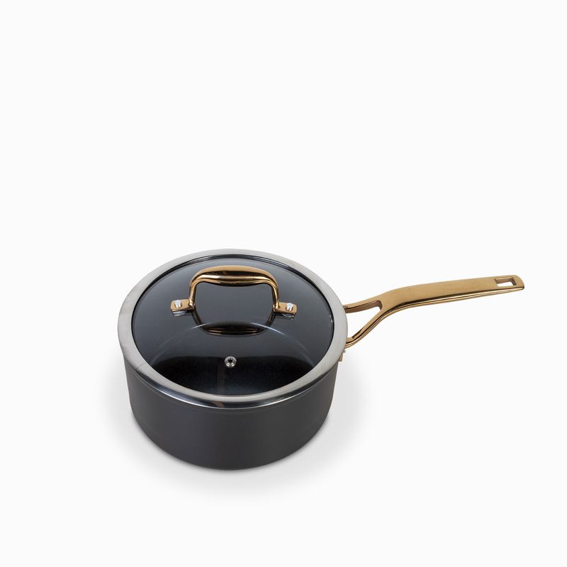 Olla en aluminio de color cobre y negro, de mango largo. Resistente a abrasión y con atributos antiadherentes que la hacen práctica para el uso diario en la cocina. Se calienta rápidamente y de manera uniforme, sin necesidad de altas temperaturas, brindando mayor control al momento de cocinar para crear una mejor cocción.