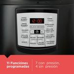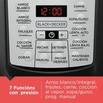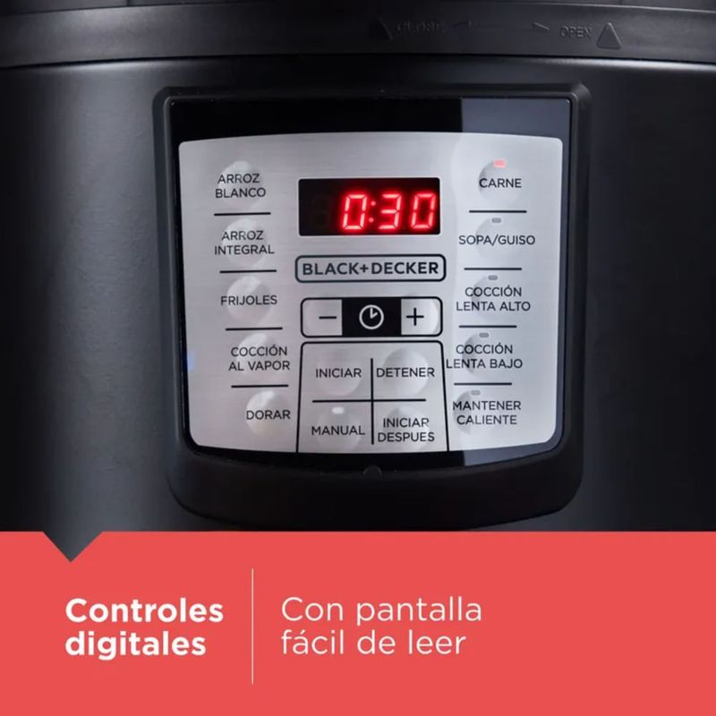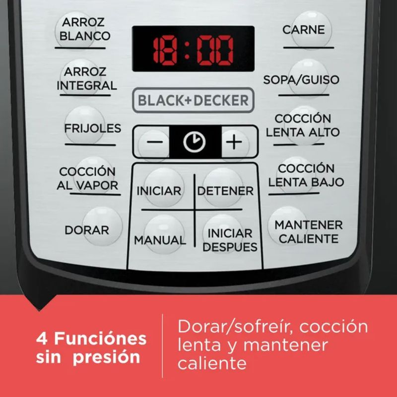 Prepara tus platos favoritos con la Olla multicocción de 5.7 L de BLACK+DECKER®. 7 funciones de presión: arroz, frijoles, todo tipo de carne, sopas, guisos y mucho más. 4 funciones sin presión: dorar o sofreír, cocción lenta (alta y baja) y mantener caliente 9 sistemas de seguridad independientes para asegurar que la unidad funcione de forma segura Olla de cocción con revestimiento antiadherente apta para lavaplatos Controles digitales.
