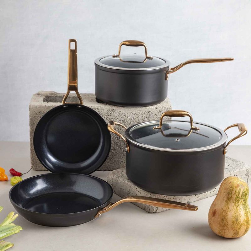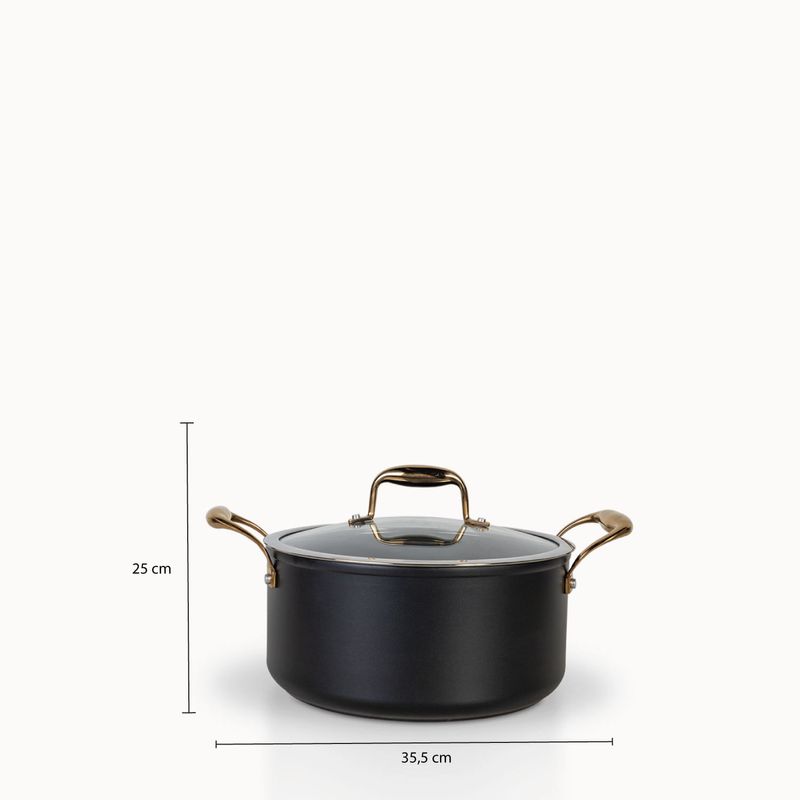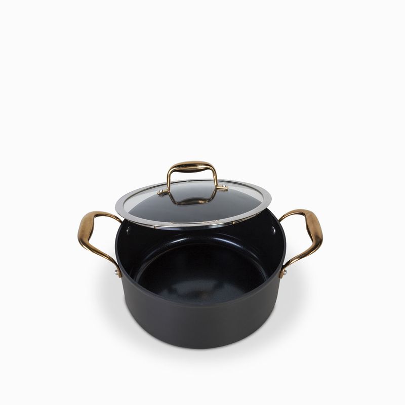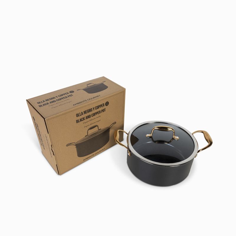 Olla en aluminio de color cobre y negro. Resistente a abrasión y con atributos antiadherentes que la hacen práctica para el uso diario en la cocina. Se calienta rápidamente y de manera uniforme, sin necesidad de altas temperaturas, brindado mayor control al momento de cocinar para crear una mejor cocción.
