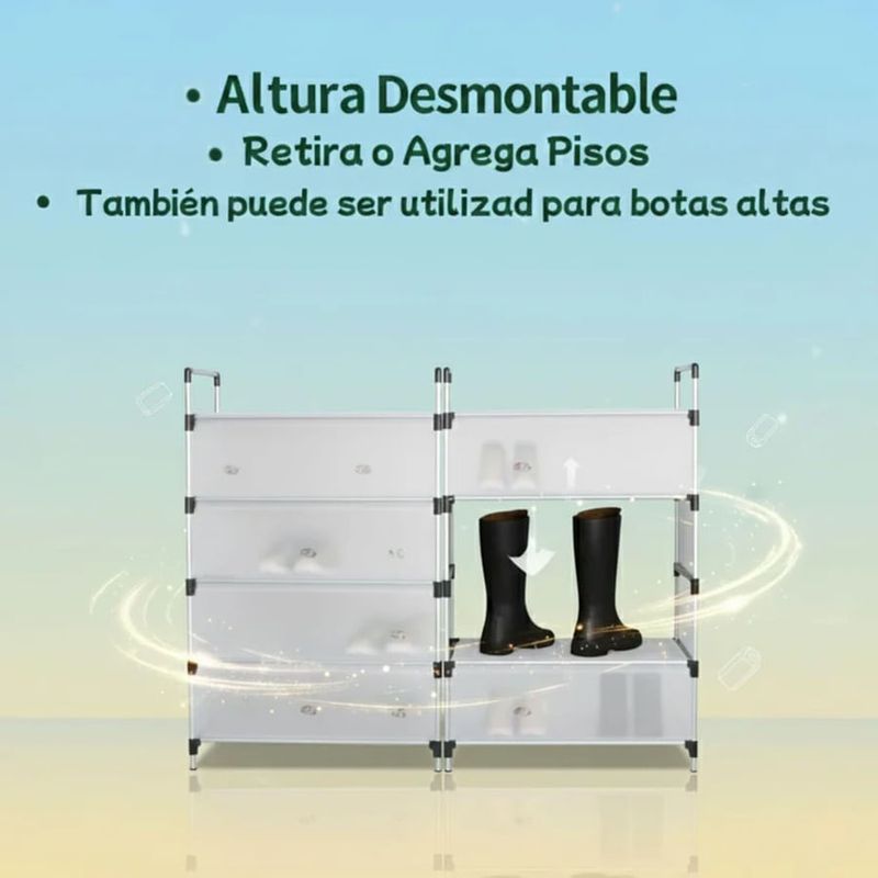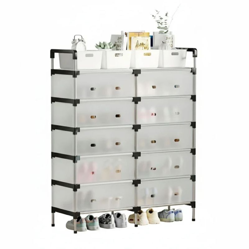 Este organizador modular versátil es la solución ideal para maximizar el espacio de almacenamiento en cualquier habitación. Con un diseño de diez compartimentos cerrados distribuidos en dos columnas y cinco niveles, ofrece un amplio espacio para guardar zapatos, ropa, accesorios u otros artículos de manera ordenada y protegida del polvo. Su estructura ligera pero robusta y los paneles translúcidos permiten identificar el contenido sin abrir cada puerta. Además, la parte superior plana sirve como una estantería abierta para colocar cajas, libros o elementos decorativos. Es perfecto para dormitorios, entradas, vestidores o cuartos de servicio.
