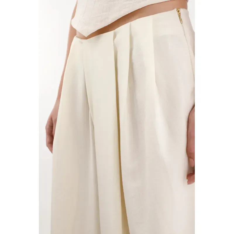 Confeccionado en mezcla de viscosa y poliéster que aporta estructura sin perder movimiento. Pretina cruzada y prenses delanteros que suman detalle y sofisticación.
